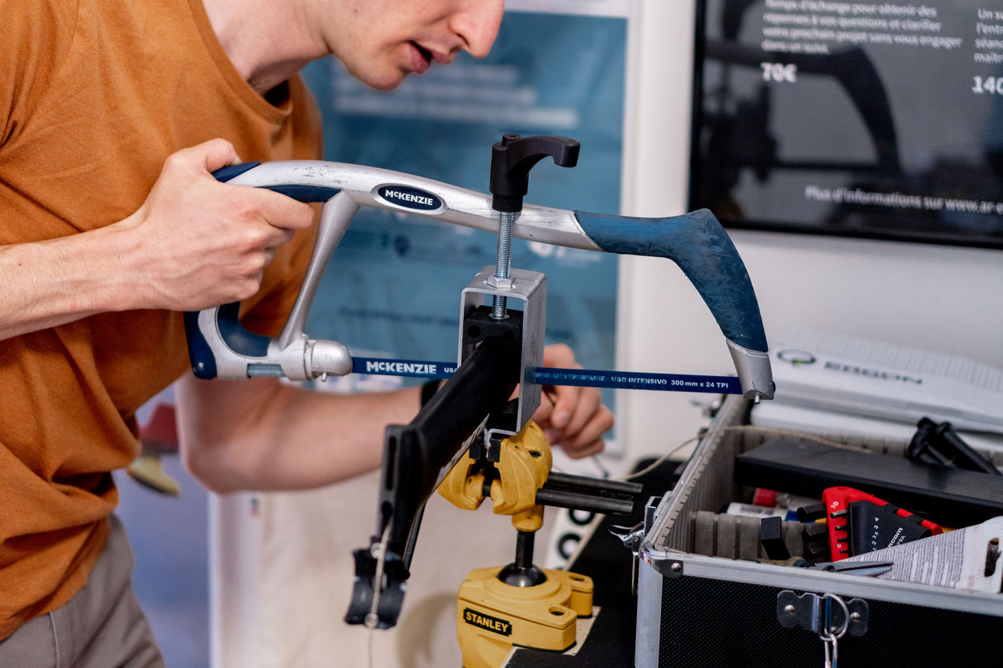 Il était fréquent que vous veniez nous rencontrer avec parfois un modèle de selle qui ne vous convenait pas tout à fait, avec parfois de réelles conséquences négatives sur votre pratique : il était alors compliqué de réaliser une étude très pertinente dans ce cas. Parce que le contact selle / bassin est le principal point de pression il nous a semblé alors essentiel de pouvoir vous proposer différents modèles de selle pour les tester et réaliser l'analyse directement avec le matériel adapté. Il en est de même avec d'autres composants comme les potences et les cales par exemples : l'objectif est que vous repartiez dans la mesure du possible avec votre vélo réglé et équipé des bons composants, ou tout du moins avec l'ensemble des éléments et informations nécessaires pour effectuer ces modifications ultérieurement. On évite alors les erreurs d'achats, vous repartez en sachant quoi faire.